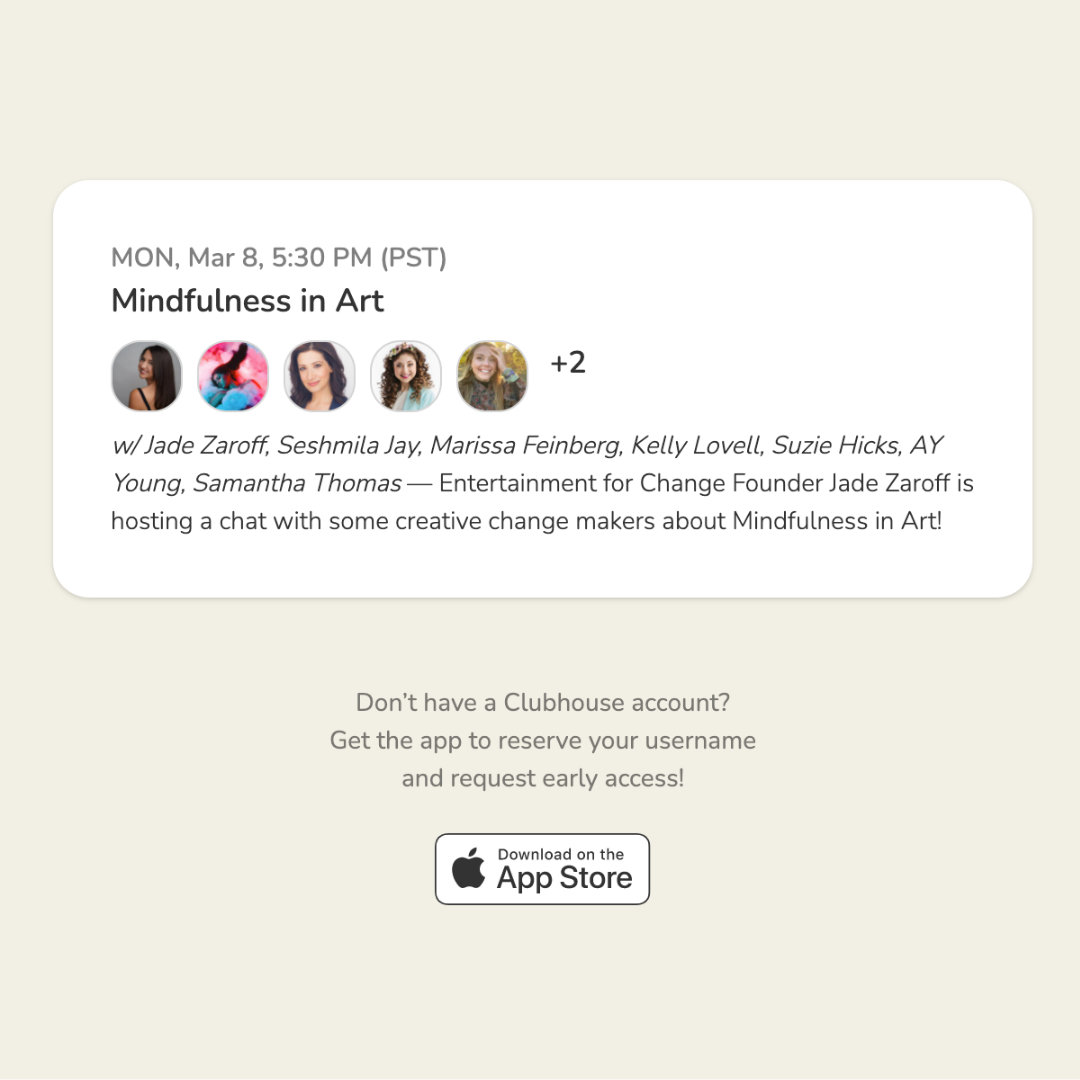 At 8:30pm - Entertainment for Change Founder Jade Zaroff is hosting a chat with some creative change makers about Mindfulness in Art! Join Seshmila Jay, Kelly Lovell, Suzie Hicks, AY Young, Samantha Thomas and me.