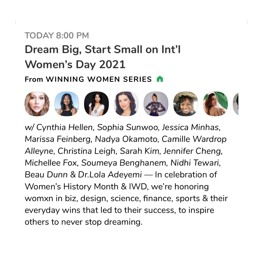At 8pm - Winning Women is honoring womxn in business, design, science, finance, and sports and their small wins that led to their success in life, to inspire others to never stop dreaming. Starting on March 8th, the series will be featuring on social media, women in our community who encourage us to take the first step towards our goals, see the opportunities of small wins and learn to celebrate them. Society influences us in thinking that success happens overnight. But these women show us that success is a progressive experience, by acknowledging the small wins, dreams can be achieved.