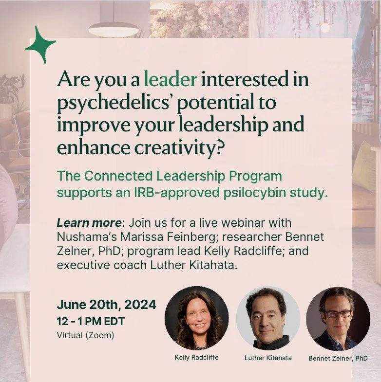 Explore the science of psychedelics for creativity, leadership, and decision-making with Bennet Zelner, Ph.D. and learn about the Connected Leadership Study that he is co-leading with Rachelle Sampson, Ph.D. Also learn about the upcoming cohorts for the Connected Leadership Program from Program Lead Kerry Radcliffe and Executive Coach Luther Kitahata. Moderated by Marissa Feinberg, PR & Brand Director of Nushama, and Founder of Psychedelics for Climate Action (PSYCA).